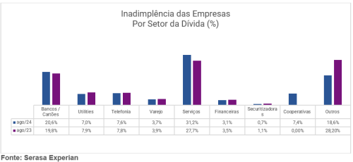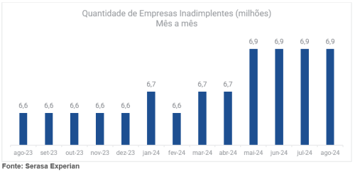 O fato: Dados da Serasa Experian revelaram que, em agosto, 32,6% das empresas brasileiras estavam inadimplentes, correspondendo a 6,9 milhões de companhias. Esse índice se manteve estável nos últimos quatro meses, com o valor total das dívidas somando R$ 149,1 bilhões e um ticket médio de R$ 2.977 por conta atrasada.