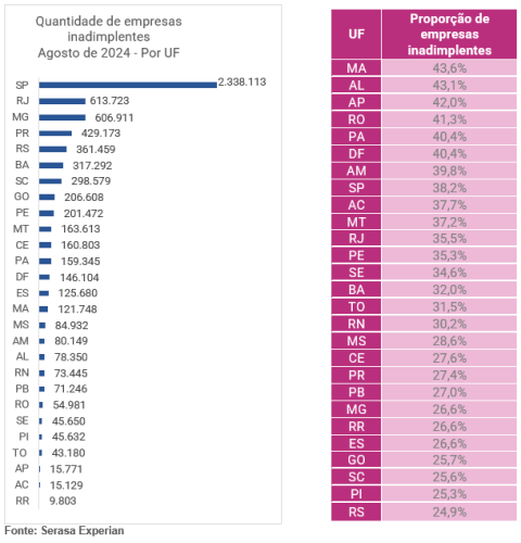 Distribuição por regiões: Os estados com maior taxa de inadimplência empresarial foram Maranhão, Alagoas, Amapá, Rondônia e Pará. Na outra ponta, Espírito Santo, Goiás, Piauí, Santa Catarina e Rio Grande do Sul registraram as menores taxas. Entre as 6,9 milhões de empresas inadimplentes, 6,4 milhões são micro e pequenas, acumulando mais de 45,3 milhões de dívidas e um valor superior a R$ 128,1 bilhões.