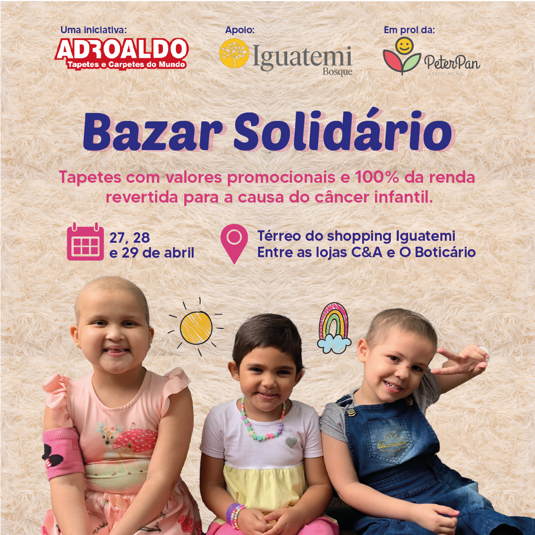 A empresa Adroaldo Tapetes do Mundo promove um Bazar Solidário em prol da Associação Peter Pan com 100% das vendas revertidas para a instituição. O evento acontece nos dias 27, 28 e 29 de abril, das 10h às 22h, em espaço cedido pelo Iguatemi Bosque Fortaleza.