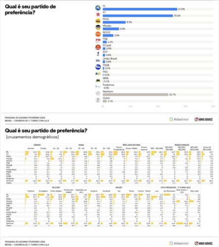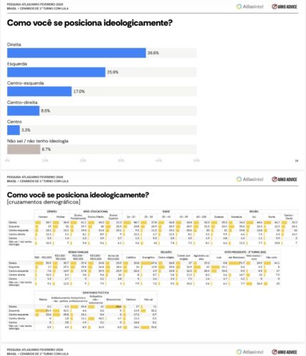 A AtlasIntel captura o que está por trás da política hoje: não apenas preferência, mas identidade. O país se inclina à direita, porém com bases desiguais e alta volatilidade.