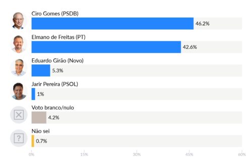No cenário mais provável neste momento, com Elmano candidato à reeleição e Ciro Gomes na oposição, os números indicam confronto competitivo: