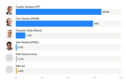 A pesquisa Atlasintel ouviu 1.200 cearenses entre 27 e 30 de março. A margem de erro é de tres pontos percentuais para cima ou para baixo.