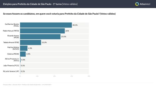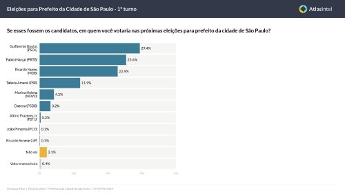 O fato: A nova pesquisa do instituto AtlasIntel para a prefeitura de São Paulo, divulgada nesta segunda-feira, 30, revelou que o candidato Guilherme Boulos (Psol) está 29,4% das intenções de voto.