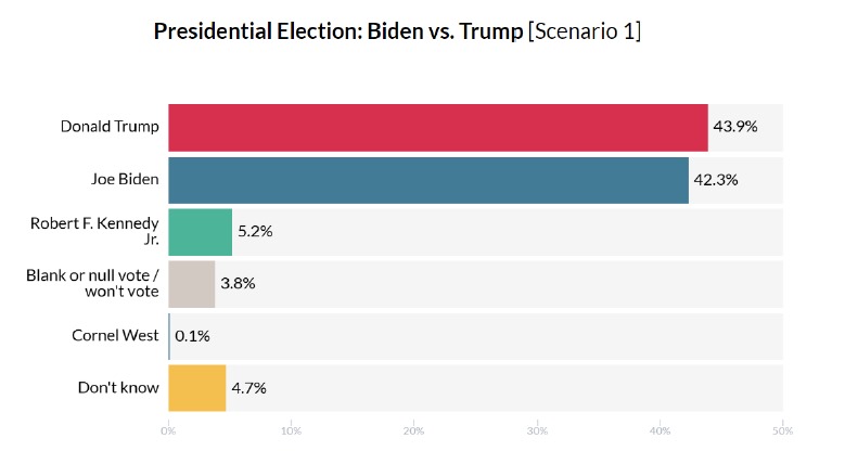 Robert F. Kennedy Jr., que deve disputar o pleito de forma independente, aparece com 5,2%. Os entrevistados que planejam votar branco, nulo ou não ir votar são 3,8%, enquanto os que não sabem em quem votar são 4,7%.