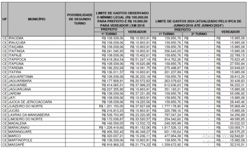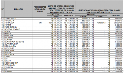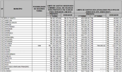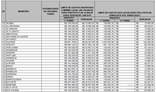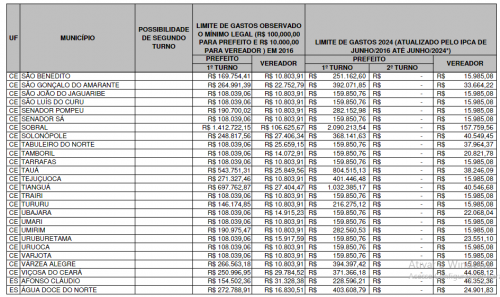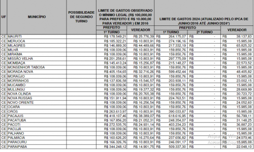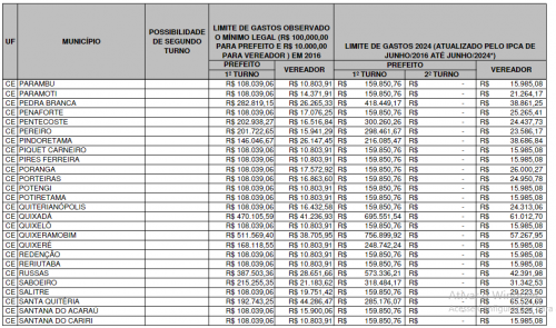 O relatório também aponta as cidades menos populosas. Em Senador Sá, os limites são de R$ 159.850,76 para prefeito e R$ 15.985,08 para vereador. Em Altaneira, também são R$ 159.850,76 para prefeito e R$ 15.985,08 para vereador. Em Jaguaribe, o limite é de R$ 612.636,63 para prefeito e R$ 56.222,31 para vereador.