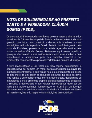 O Partido Socialista Democrático Brasileiro (PSDB) divulgou uma nota de solidariedade, nesta quinta-feira, 1º, após a vereadora Cláudia Gomes sofrer agressão na Câmara Municipal de Fortaleza (CMFOR). “Além de impedir a fala do Prefeito José Sarto, eleito pelo povo …