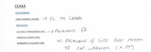 Da reunião, Valdemar da Costa Neto e Rogério Marinho também teriam participado. São anotações sobre possíveis palanques nos estados.