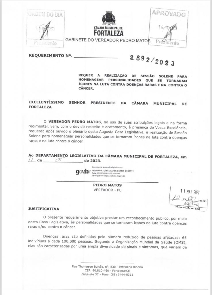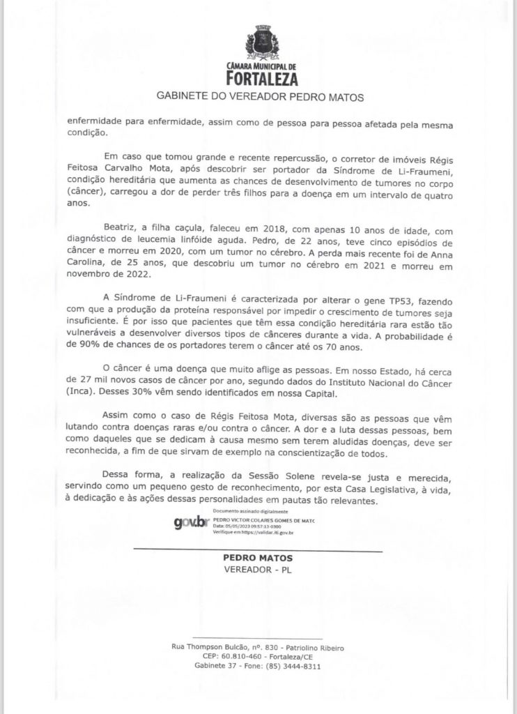 “Assim como no caso de Régis Feitosa Mota, diversas são as pessoas que vêm lutando contra doenças raras e/ou contra o câncer. Dessa forma, a realização da Sessão Solene revela-se justa e merecida, servindo como um pequeno gesto de reconhecimento, por esta Casa Legislativa, à vida, à dedicação e às ações dessas personalidades em pautas tão relevantes”, completou o vereador.