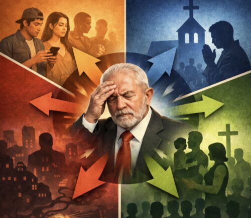 Por fim, outro recorte agravante é de base religiosa e remete a uma clara reação conservadora, de preservação de valores que se concentram na noção nuclear da família, no campo dos costumes: um exército mobilizável de 85% dos evangélicos desaprovam o governo Lula (são razoáveis 45%, entre os católicos).