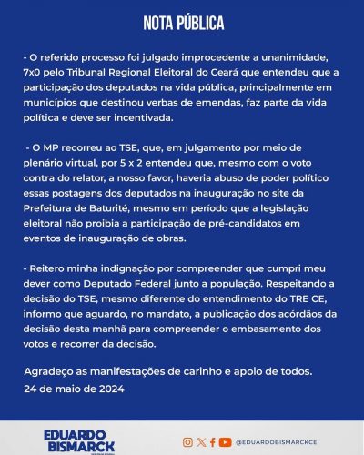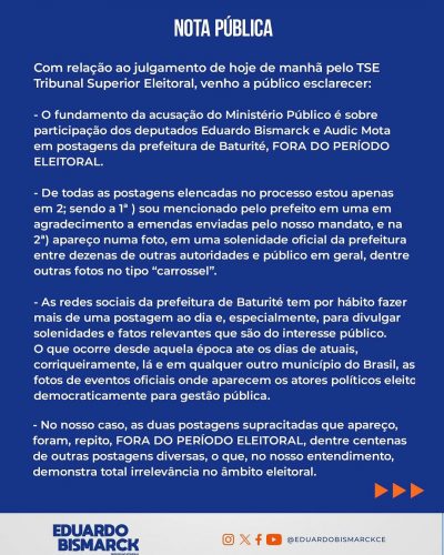 Em nota, Eduardo Bismarck justificou que, as duas postagens citadas ocorreram fora do período eleitoral. “No nosso entendimento, demonstra total irrelevância no âmbito eleitoral”, ressaltou.