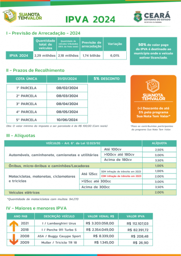 O Ceará possui uma frota atual total de cerca de 2.297.742 milhões de veículos, Destes, 5% são não tributados (imune e isentos). A previsão do estado do Ceará é arrecadar em torno de R$ 1,74 bilhão. Do total recolhido, 50% pertencem ao Tesouro Estadual. Os outros 50% são destinados aos municípios onde os veículos estão licenciados.