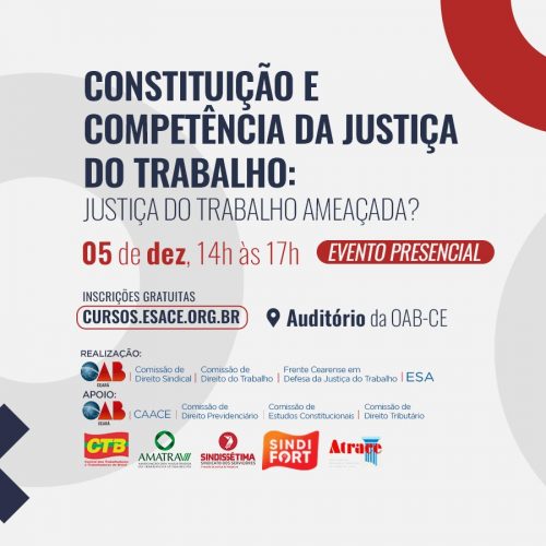 A OAB-CE, em parceria com a Escola Superior de Advocacia do Ceará (ESA-CE) e a Frente Cearense em Defesa da Justiça do Trabalho, promove nesta terça-feira (05/12) o curso gratuito “Constituição e Competência da Justiça do Trabalho: Justiça do Trabalho Ameaçada?”. A capacitação é gratuita e será realizada no Auditório da Ordem, das 14h às 17h.