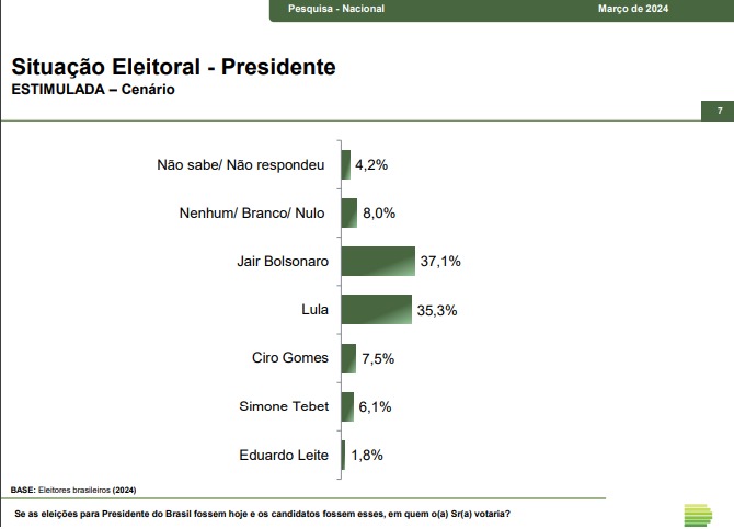 Já o presidente Lula (PT) aparece em seguida com 35,3% das intenções de voto. Em terceiro vem Ciro Gomes (PDT), com 7,5%. Logo depois vem Simone Tebet ( MDB) com 6,1% e Eduardo Leite (PSDB) com 1,8%.
