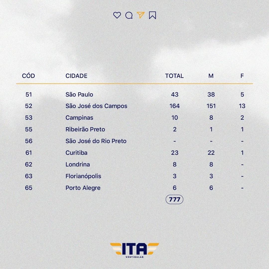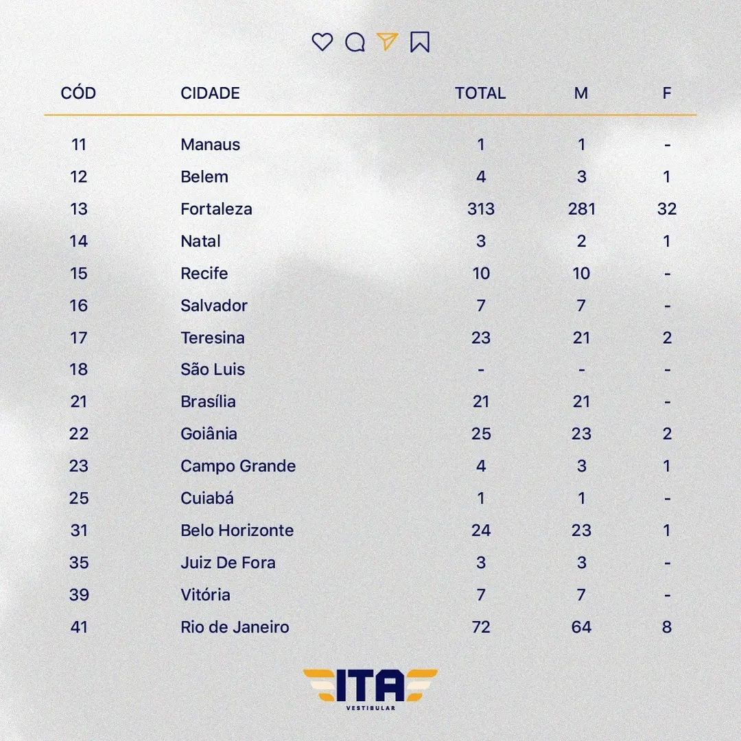 Segundo o ITA, Fortaleza foi cidade com maior número de aprovação do Brasil. Em seguida vem São José dos Campos, com 164 dos alunos aprovados. O Rio de Janeiro aparece com 72; São Paulo registra 43.