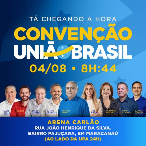 A convenção que oficializará os candidatos a prefeito, vice-prefeito e vereadores pelo UB e demais aliados está marcada para o próximo domingo, dia 4, às 8h44, na Arena Carlão, no bairro Pajuçara. A imagem que convoca para o evento destaca Capitão Wagner de um lado, na ponta esquerda, e os petistas do outro, com RP posicionado bem no centro.