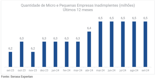 Explicação: “Quando a economia enfrenta desafios, como altas taxas de juros e inflação, as micro e pequenas são as primeiras a sentir o impacto, pois têm menos margem de manobra para absorver choques econômicos. Além disso, elas enfrentam dificuldades adicionais, como acesso limitado a crédito e financiamento. Bancos e instituições financeiras tendem a ser mais cautelosos ao conceder empréstimos para esses negócios devido ao maior risco percebido. Isso cria um círculo vicioso em que a falta de acesso a capital impede o crescimento e a sustentabilidade dessas empresas, aumentando ainda mais a probabilidade de inadimplência”, explica o economista da Serasa Experian, Luiz Rabi.