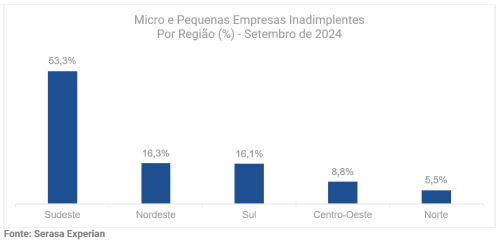 Setores: Em setembro, 55,0% das MPEs inadimplentes eram do setor de “Serviços”, 37,1% do “Comércio”, 7,5% da “Indústria” e 0,4% de “Demais”, que englobam companhias dos segmentos Primário, Financeiro e Terceiro Setor. Na visão por regiões, a avaliação do indicador mostrou que a maior parte das MPEs com CNPJs negativados eram do Sudeste (53,3%) e a menor parcela do Norte (5,5%).