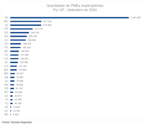 Estados: As Unidades Federativas (UFs) que lideraram o ranking com mais Micro e Pequenas Empresas inadimplentes foram São Paulo (2.207.002), Minas Gerais (577.519) e Rio de Janeiro (574.450).