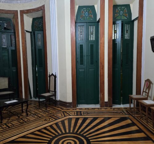 Tive a alegria de ler claramente as iniciais dele e a data de 1920, demonstrativas de seu orgulho pela obra, inscritas ambas no piso, e a cruz traçada no teto indicando o local onde havia sido a capela. Presenciei a claridade penetrando outra vez pelas transparências no que eu conhecia como telha de vidro, aprendendo que se chamam de fato lanternim. Comemorei o trabalho de recuperação da escadaria de ferro, dos vitrais coloridos nas bandeiras das portas, dos ornatos minuciosamente restaurados para compor o perfil original da casa.