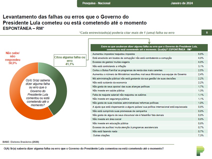 O levantamento realizado pela Paraná Pesquisas apontou que 41,1% citaram alguma falha ou erro no Governo Lula. Os que não responderam ou não sabem representam 58,9% dos entrevistados.