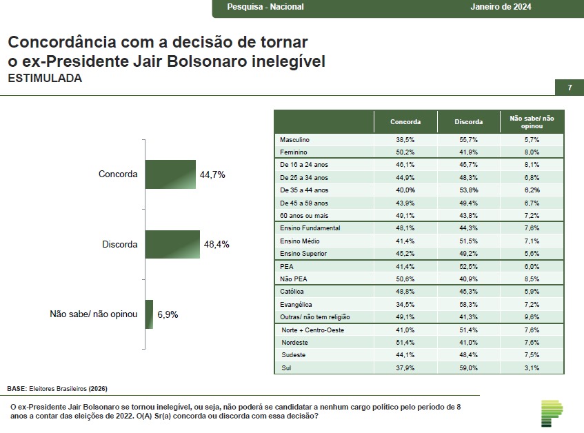 O levantamento realizado pela Paraná Pesquisas revelou que 48,4% dos brasileiros discordam da decisão que determina o ex-presidente Jair Bolsonaro inelegível até 2026.