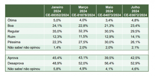 A avaliação “ruim”, por outro lado, cresceu: em janeiro, estava em 12,3% e, em julho, foi para 14,1%. Já a avaliação “péssima” passou de 22,3% em janeiro para 26,1% em julho.