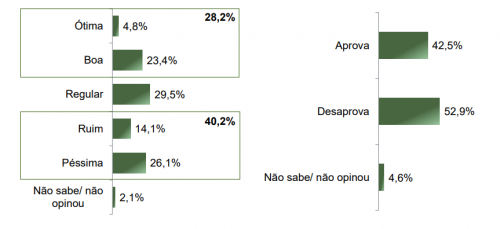 Na mesma pesquisa, 4,8% consideram a gestão ótima, enquanto 23,4% a avaliam como boa. Outros 29,5% a classificam como regular, 14,1% como ruim e 26,1% como péssima.