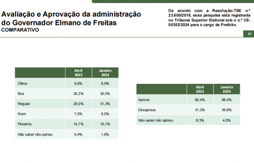 A administração estadual do governador Elmano de Freitas (PT) no Ceará teve aprovação de 56,4%, enquanto que 39,6% desaprovam. 4% não sabe ou não opinou.
