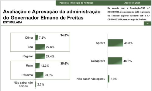 Pesquisa divulgada nesta terça-feira, 20, pelo Instituto Paraná Pesquisas, revela que a administração do governador Elmano de Freitas (PT) é aprovada por 48,8% dos fortalezenses, enquanto 46,3% desaprovam. Outros 5% não sabem ou não opinaram. O petista está no segundo ano de seu primeiro mandato.