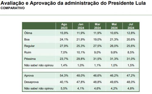Comparando com os dados de agosto de 2023, a avaliação ótima caiu de 15,9% para 12,8%. A avaliação péssima aumentou de 23,7% para 31%.