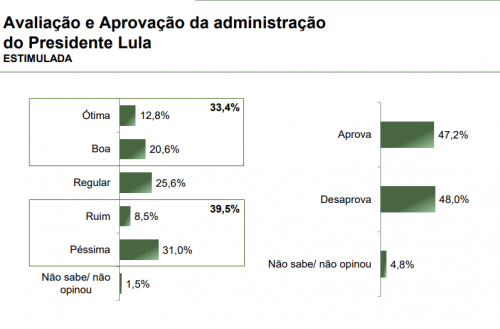 De acordo com o Paraná Pesquisas, o presidente Lula (PT) tem uma taxa de aprovação de 47,2% e uma taxa de desaprovação de 48%.