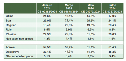 A administração do governo Lula (PT) foi aprovada por 51,4% dos cearenses, enquanto 45,3% desaprovam. De acordo com o levantamento do Paraná Pesquisas, 17% consideram a gestão ótima, enquanto 24,1% a avaliam como boa.