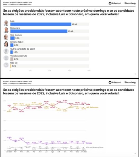 A pesquisa Atlas/Bloomberg (janeiro de 2026) ouviu 5.418 brasileiros adultos entre 15 e 20 de janeiro, com margem de erro de ±1 p.p. e nível de confiança de 95%. O levantamento utilizou a metodologia Atlas RDR (recrutamento digital aleatório), com amostra pós-estratificada por sexo, idade, escolaridade, renda, região e voto anterior. Registro no TSE: BR-02804/2026.