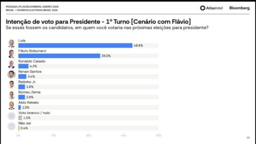 • Cenário com Flávio Bolsonaro: Lula 48,8% vs. Flávio 35%.