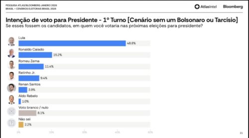 • Sem Bolsonaro e sem Tarcísio: Lula salta para 48,8%, enquanto o segundo colocado (Ronaldo Caiado) não passa de 15%.