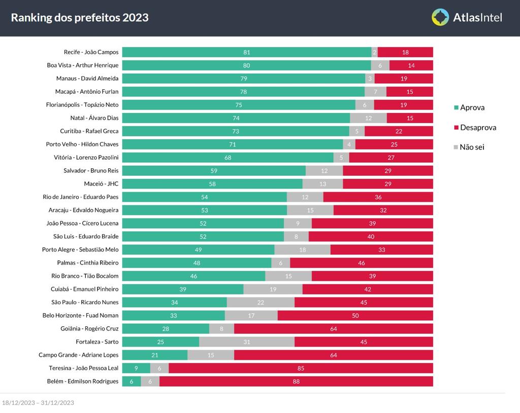 João Campos (PSB), prefeito de Recife, lidera o ranking com 81% de aprovação.