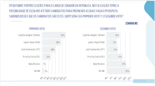 A pesquisa Real Time Big Data desenha um cenário claro para o momento: Capitão Wagner está consolidado. Porém, o cenário é movediço e tudo que é parece sólido pode desmanchar. A segunda vaga, disputada voto a voto entre Junior Mano, Eunício, Guimarães e Priscila, apresenta alto grau de indecisão. A eleição para o Senado no Ceará será menos sobre quem lidera e mais sobre quem consegue se tornar a escolha complementar do eleitor.