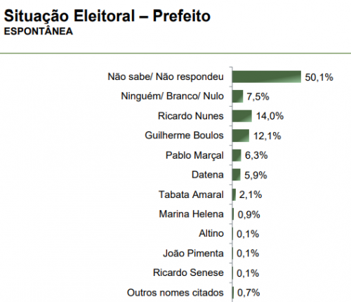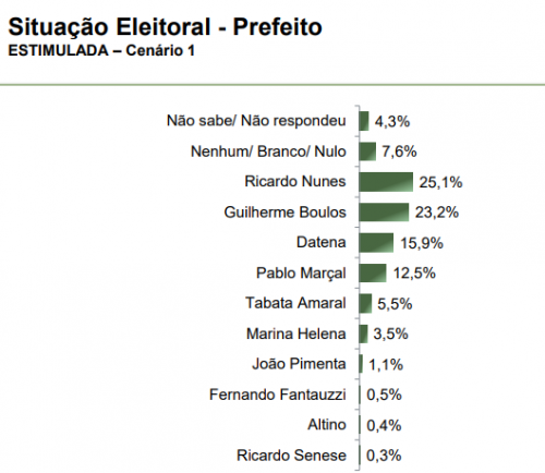 Já na Estimulada, Nunes aparece com 25,1% das intenções de voto, enquanto Boulos tem 23,2%. Na sequência, o apresentador José Luiz Datena (PSDB) surge na terceira colocação na preferência dos entrevistados, com 15,9%.