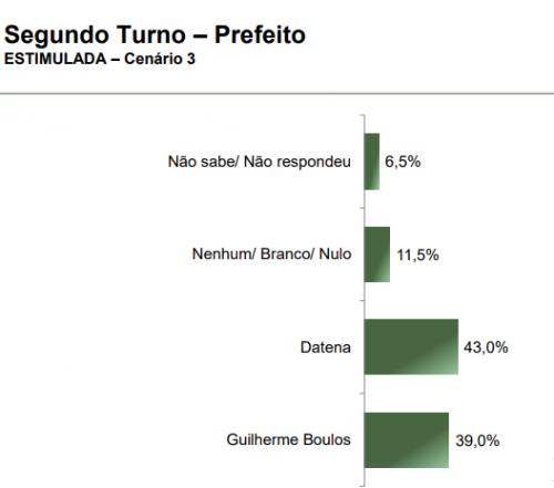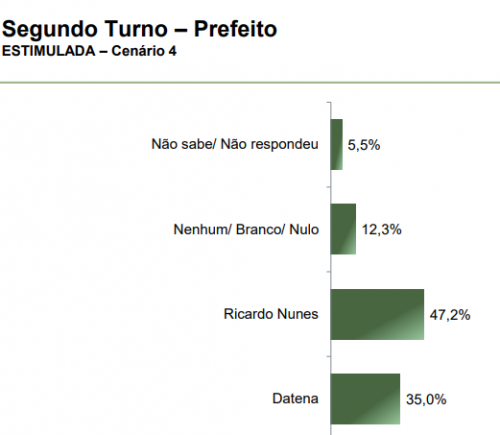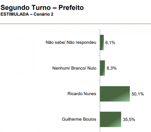 No cenário de um possível segundo turno, os resultados seriam os seguintes: em uma disputa entre Nunes e Boulos, Nunes obteria 50,1% dos votos, enquanto Boulos ficaria com 35,5%. Se a disputa fosse entre Datena e Boulos, Datena teria 43% e Boulos, 39%. Por fim, em uma disputa entre Nunes e Datena, Nunes alcançaria 47,2% e Datena, 35%.