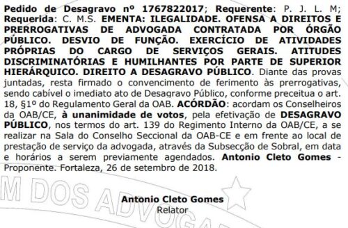 Em 2018, a Ordem dos Advogados do Brasil, secção Ceará, aprovou ato de Desagravo Público contra o município sobralense por atentado contra prerrogativa advocatícia da servidora contratada. O processo teve a relatoria do conselheiro advogado Antônio Cleto Gomes da OAB Ceará.
