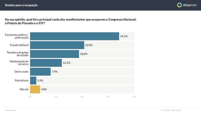 Um levamento realizado pela AtlasIntel apontou que 34% dos brasileiros acreditam que a invasão ao STF foi o fanatismo político e a polarização.