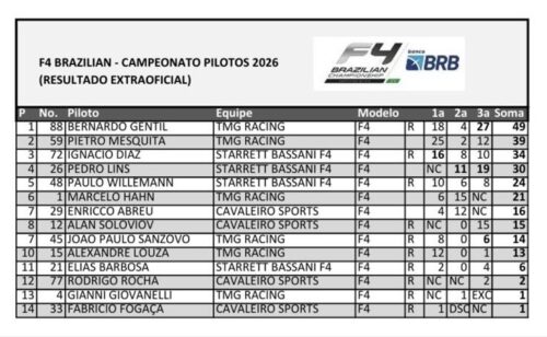 Nos bastidores, o desempenho de Bernardo Gentil também reflete uma estrutura sólida dentro e fora das pistas. O piloto conta com o apoio de marcas como Capemisa Seguradora, Beach Park e Libercard. Na operação da TMG Racing, o comando técnico é liderado pelo engenheiro-chefe Felippi Forti, com Douglas Cesario à frente da mecânica, enquanto a preparação do piloto é conduzida pelos coaches Leandro Gomez e Erick Lutum — uma engrenagem afinada que ajuda a explicar a consistência já na estreia.