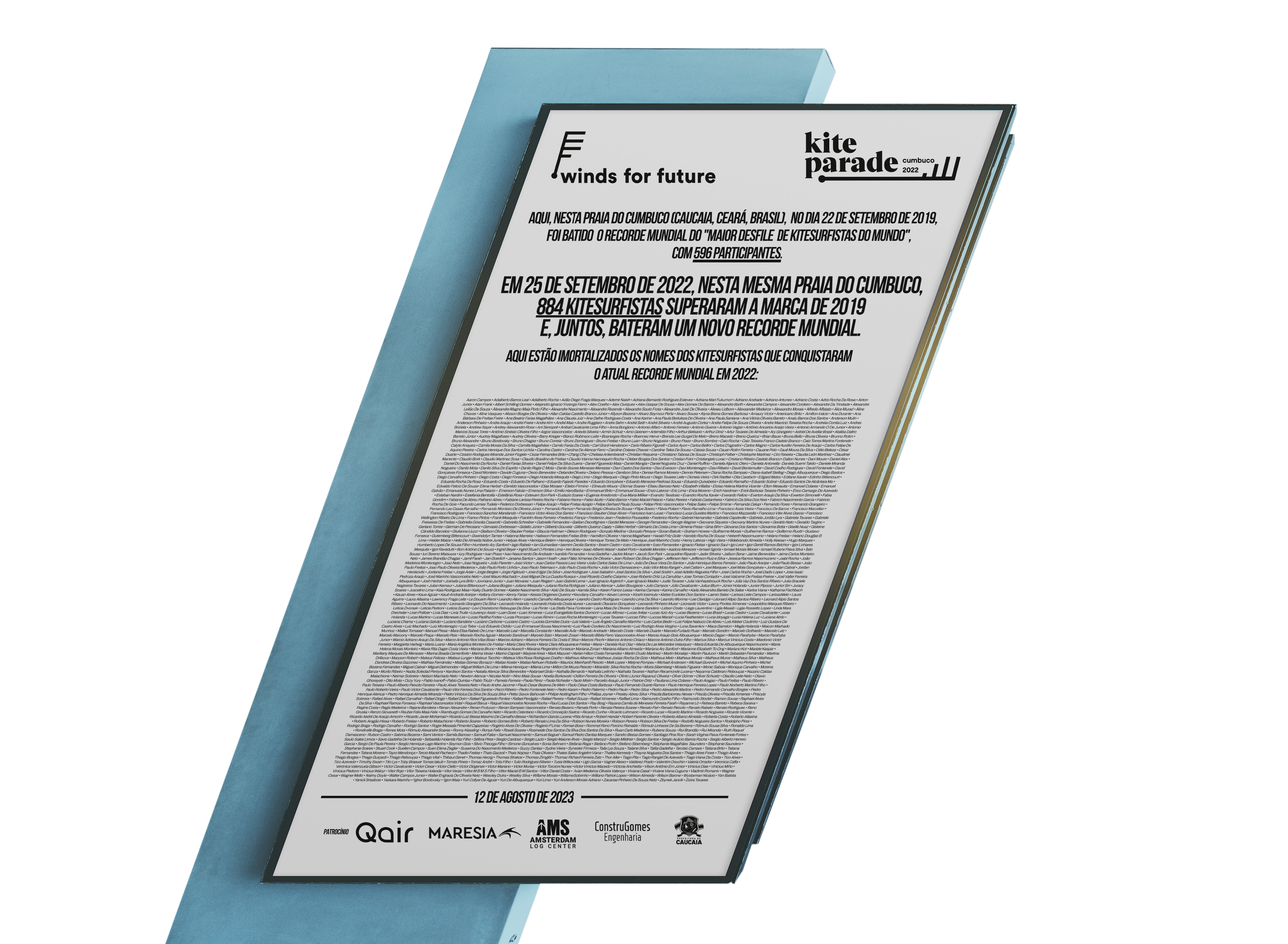 O movimento Winds For Future, com o apoio da Prefeitura de Caucaia, irá inaugurar no próximo sábado (12), às 17h30, na Praça da Vila do Cumbuco, uma placa com o nome de todos os kitesurfistas que, em setembro de 2022, quebraram o recorde mundial do maior desfile de kitesurf e tiveram seus nomes inscritos no Guinness World Records. Ao todo, a placa de quase 3 metros de altura contará com mais de 1.000 nomes de velejadores de 34 nacionalidades diferentes.